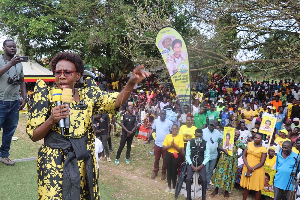 Patrick Rolex Akena, cousin of Amongi and the day’s Master of Ceremonies, told supporters to inform Amongi that “this race is impossible for her,” urging her to step down.