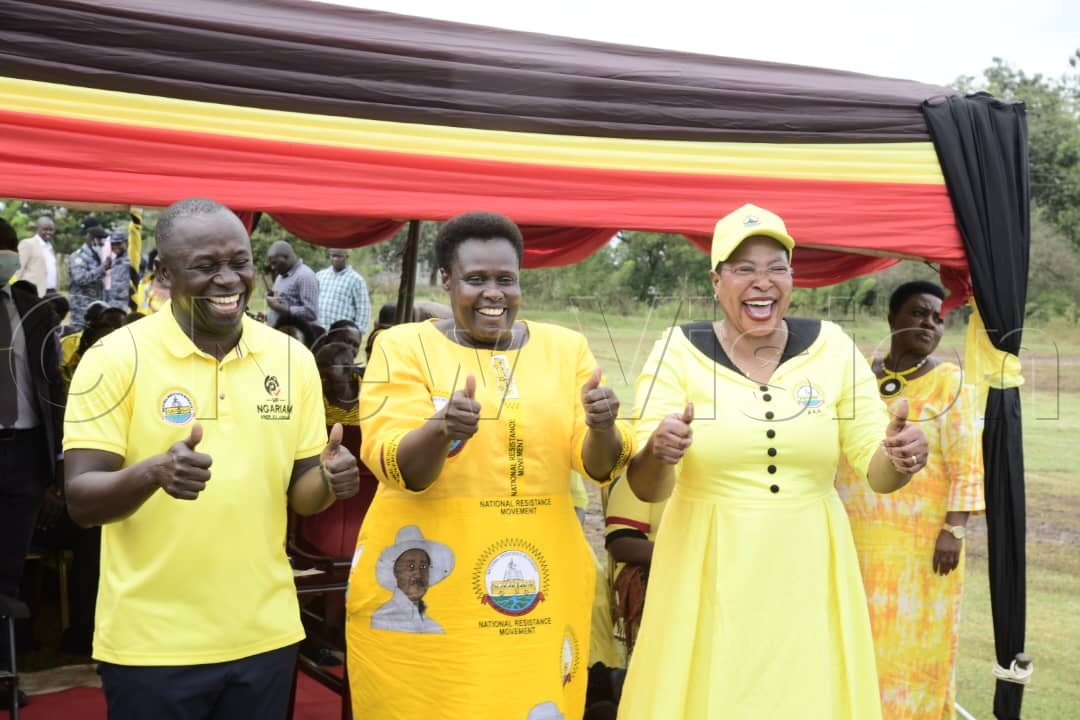 __________________ Bebe Cool entertaining NRM supports. Jose Chameleon entertaining NRM supporters at the campaign rally. VP Alupo welcomed by district leaders. President Museveni accompanied by the First Lady and Minister of Education and Sports, Maama Janet Museveni, arrive for the rally. President seated with a shield and spear.
