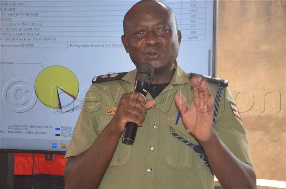 Hajji Sulaiman Lubwama Bukya, RDC Yumbe addressing candidates and agents during the ceremony to declare results on Friday evening at Yumbe EC office.