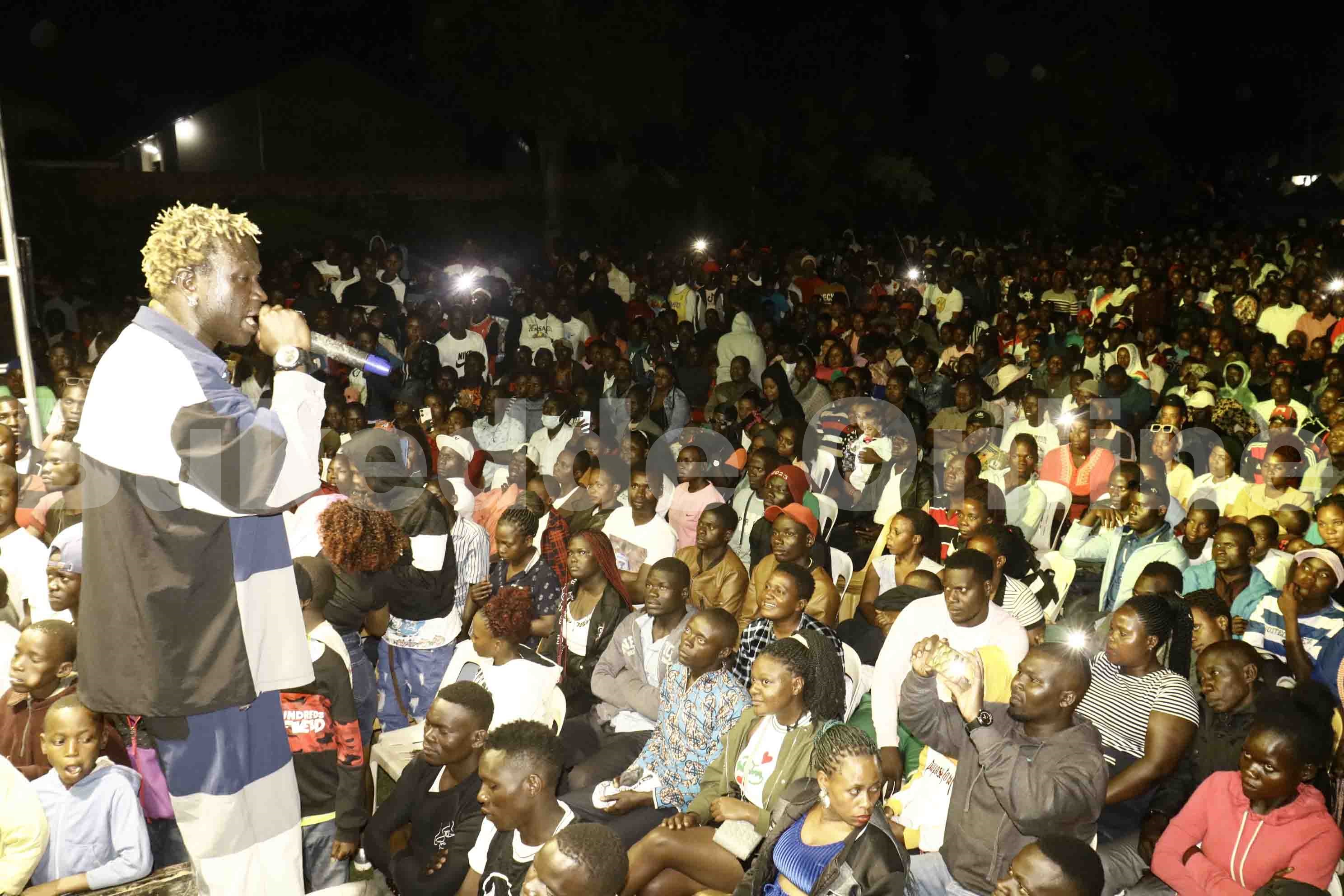 Gravity Omutujju n'omukazi nga basanyusa abantu b'e Mukono ku Summer Gardens mu Kwepiica kkonsati.