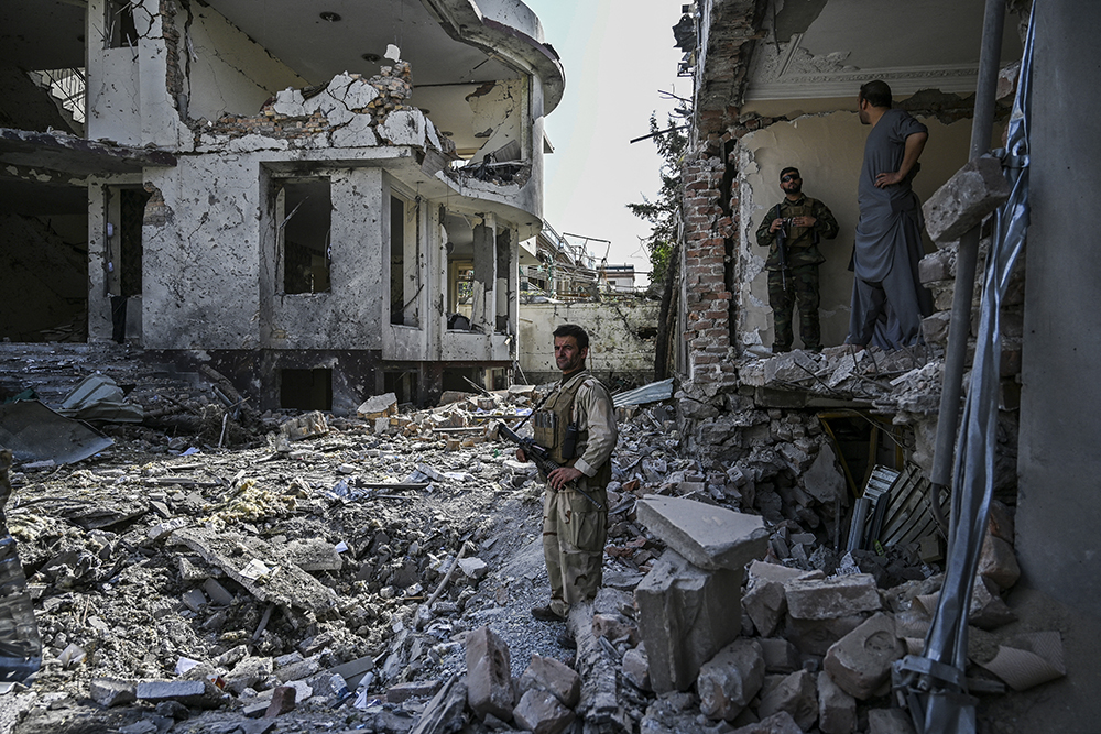 An Afghan security personnel inspects the site a day after a car bomb explosion in Kabul on August 4, 2021. (Photo by WAKIL KOHSAR / AFP)