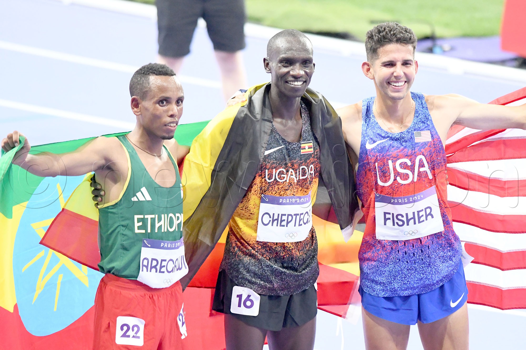 Joshua Cheptegei (centre) poses with Ethiopian Berihu Aregawi and USA's Grant Fisher after their 10000m Olympic final the Stade de France. Photo by Michael Nsubuga