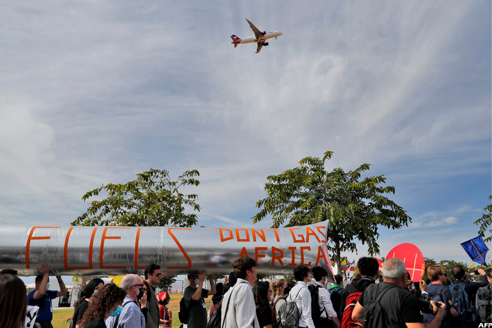 An Air Cairo passenger plane flies over Sharm el-Sheikh International Convention Centre, as climate activists protest during the COP27 climate conference in Egypt on Nov 17, 2022. (AFP)
