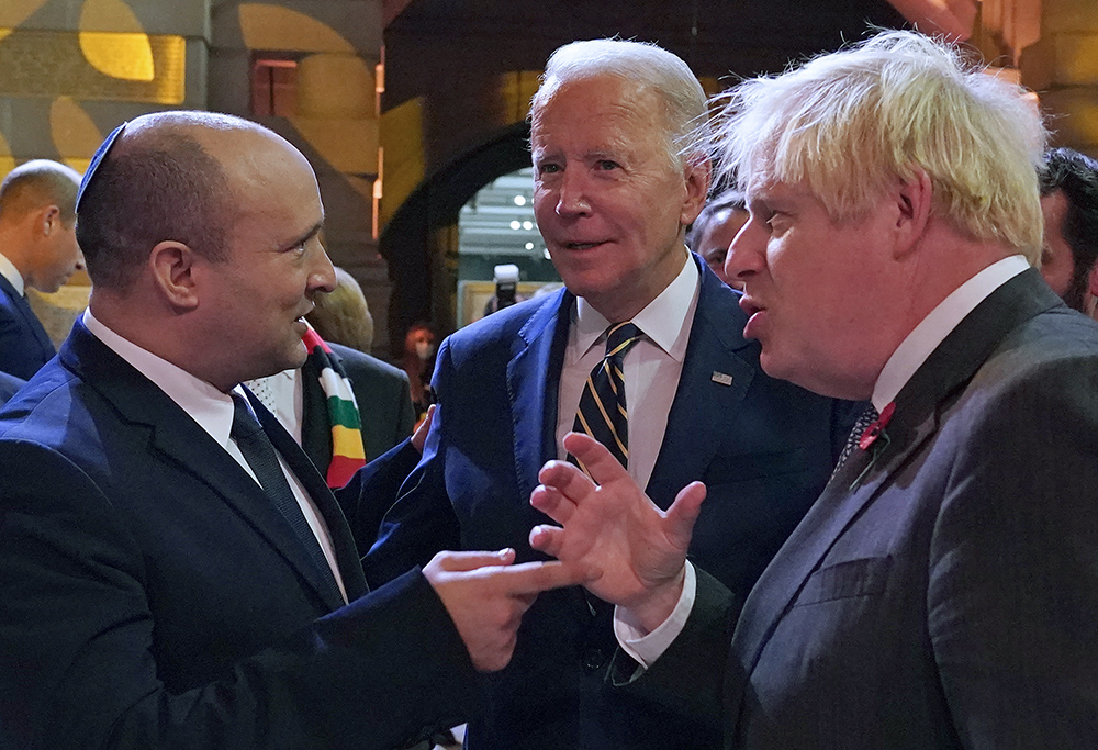 Israel's Prime Minister Naftali Bennett (L), US President Joe Biden (C) and British Prime Minister Boris Johnson (R) chat at a reception to mark the opening day of COP26 on the sidelines of the COP26