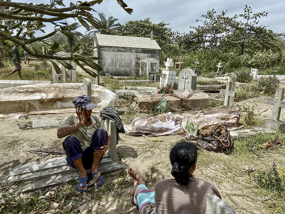 Relatives sit next to bodies exhumated from graves destroyed by the cyclon Batsirai at the local cemetery in Mahanoro on February 6, 2022. AFP photo