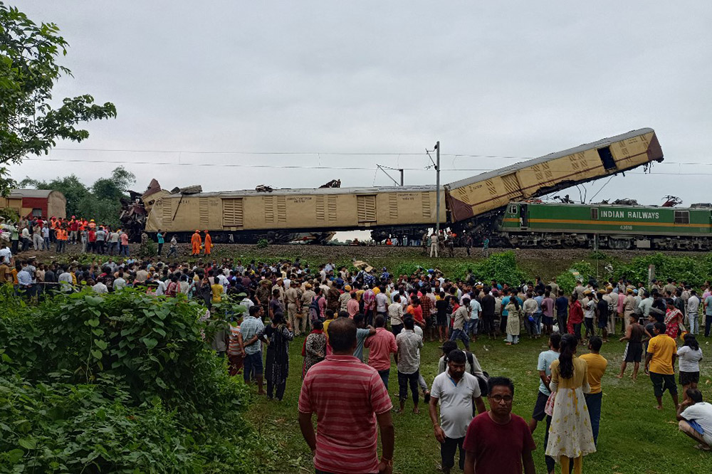 People look on at the site of a collision between an express passenger train and a goods train in Nirmaljote, near Rangapani station in India's West Bangal state on June 17, 2024.