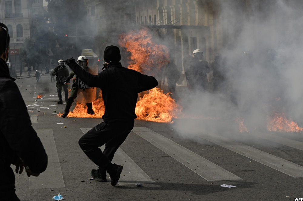 In Greece, protesters throw stones and molotov towards riot police in the center of the capital, as clashes broke-out during a 24-hour strike in Athens on March 16, 2023. (AFP)