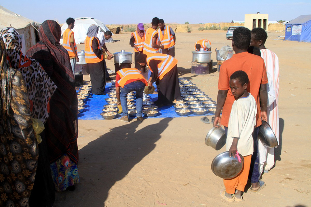 Sudanese who fled El-Fasher queue to receive free meals at the Al-Afad camp for displaced people in the town of Al-Dabba, northern Sudan, on November 20, 2025. (AFP)