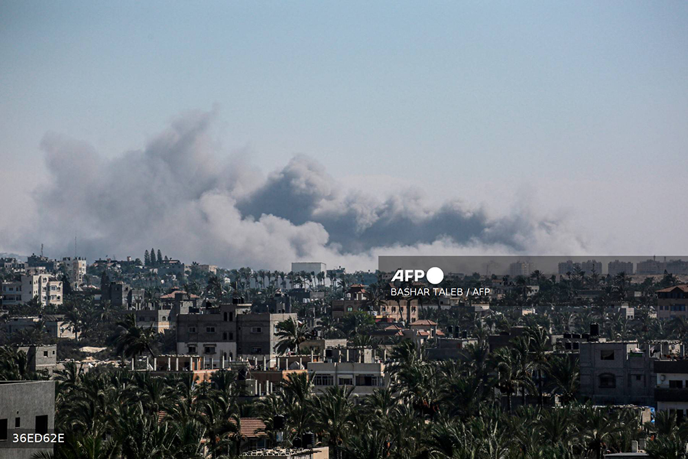 A picture taken from Deir el-Balah shows smoke billowing after an Israeli strike on Khan Yunis on August 16, 2024, amid the ongoing conflict between Israel and the Hamas militant group. (Photo by Bashar TALEB / AFP)