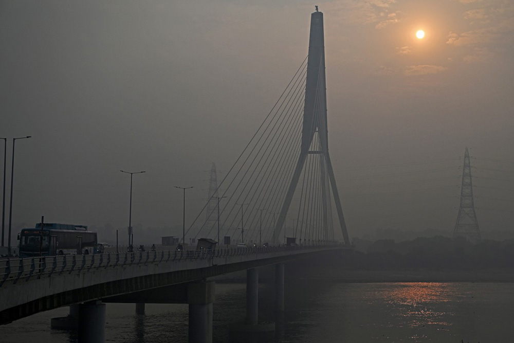 A commuter with his face covered in cloth rides along a bridge across river Yamuna in New Delhi on October 21, 2025, as smog engulfed the city skyline a day after Diwali, the Hindu festival of lights. (Photo by Arun SANKAR / AFP)