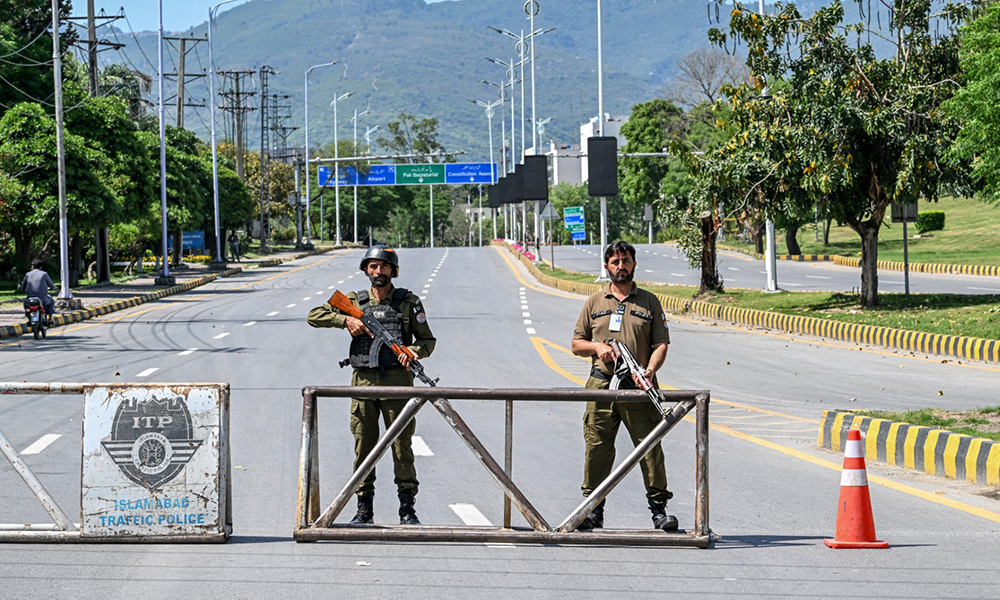 Police personnel stand guard at a closed road leading to the Serena Hotel in the Red Zone area of Islamabad on April 19, 2026. A second round of talks between the United States and Iran is expected in Islamabad this coming week. (Credit: AFP)