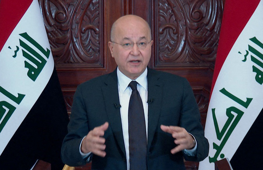 Iraq's President Media Office shows President Barham Saleh delivering a speech on August 30, 2022 in Baghdad. AFP photo