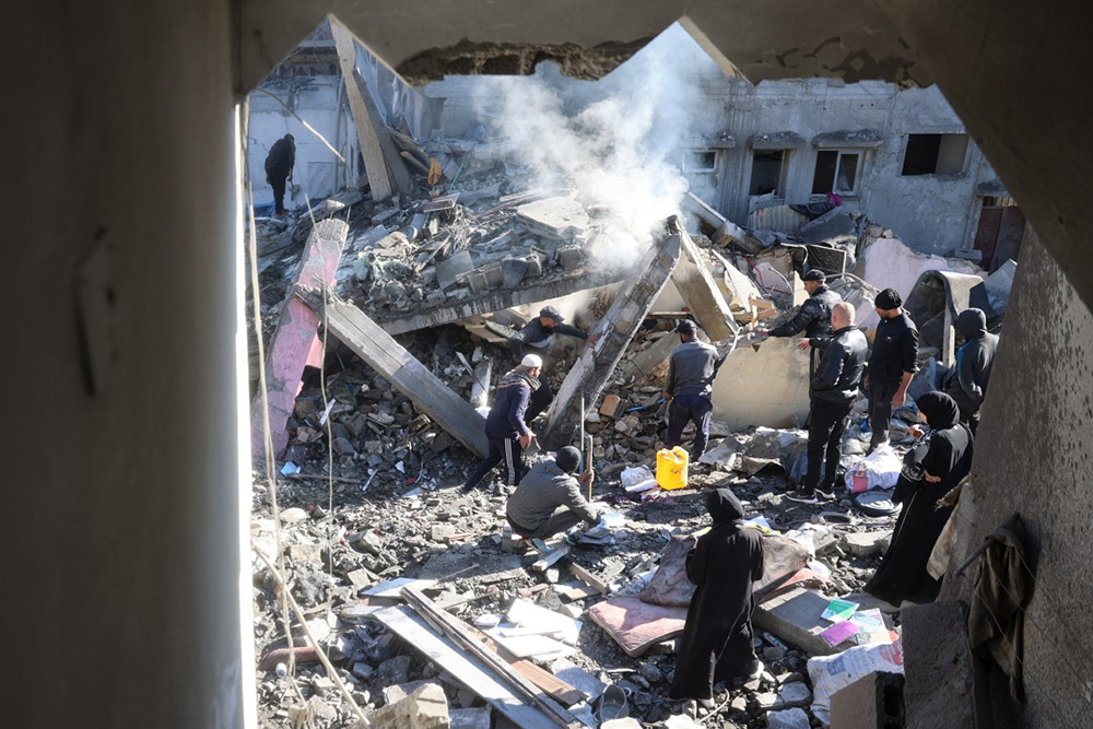 Palestinians search through the rubble of a building at the site of an Israeli strike in Khan Yunis in the southern Gaza Strip on March 23, 2025. (Photo by AFP)