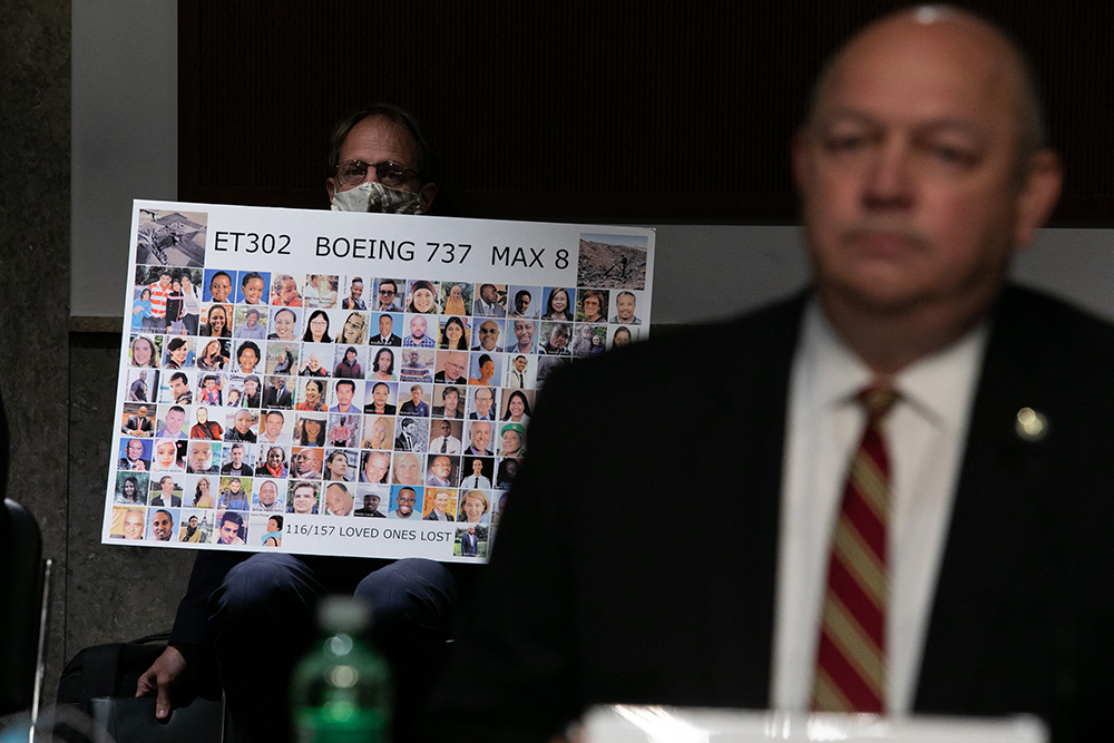 Michael Stumo holds a sign displaying photographs of the those killed in the March 10, 2019 crash of Ethiopian Airlines Flight 302 as Federal Aviation Administration (FAA) chief Steve Dickson testifies before a Senate panel examining safety certification of jetliners on June 17, 2020 in Washington, DC. (AFP)