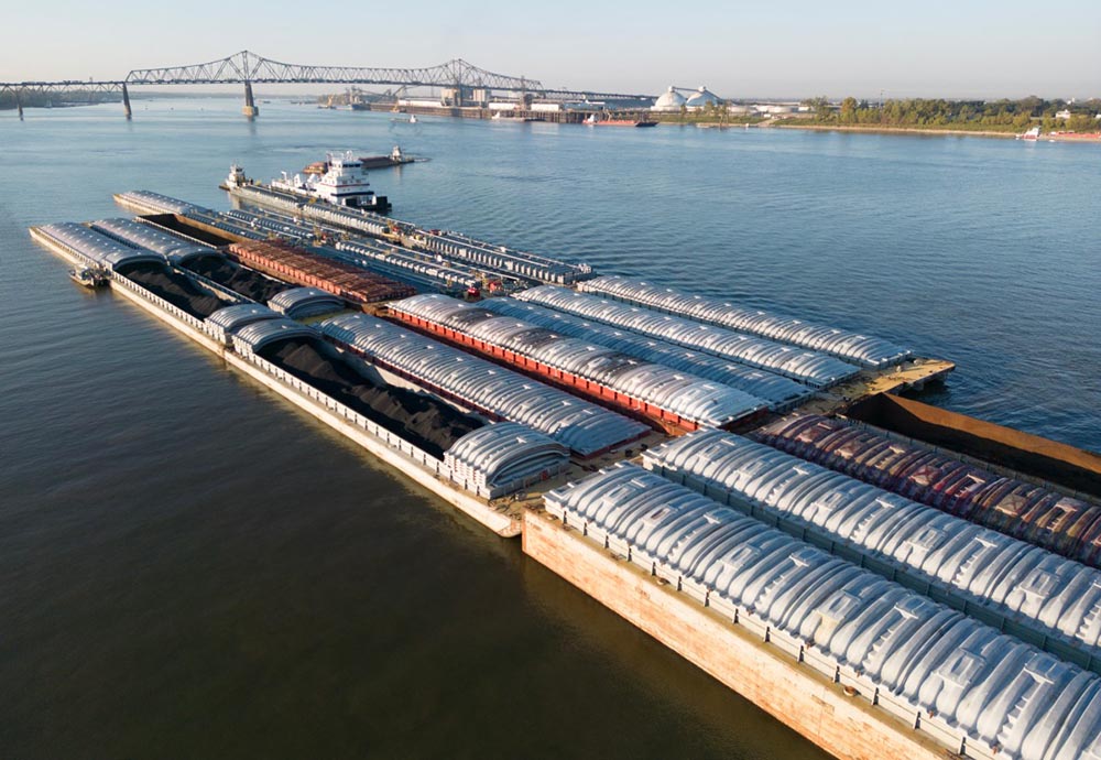 A boat pushes coal barges up the center of the river after the water level on the Mississippi river dropped to near historical lows in Baton Rouge, Louisiana on October 18, 2023. (Credit: AFP)