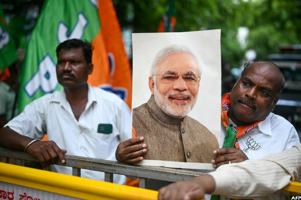 A supporter (R) of Narendra Modi, India's Prime Minister and leader of Bharatiya Janata Party (BJP) holds his portrait outside an election counting centre in Bengaluru on June 4, 2024. (AFP)