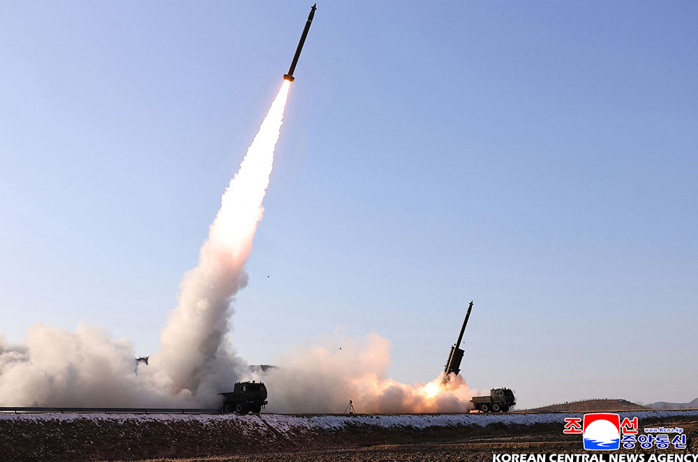 North Korean leader Kim Jong Un and his daughter Kim Ju Ae inspecting a test firing of the renewed large-calibre rocket launcher system, at an undisclosed location in North Korea