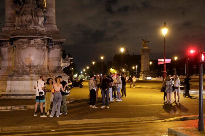 People standing in a street near Les Invalides in Paris, past the 11pm Covid-19 curfew, on Saturday.PHOTO: AFP