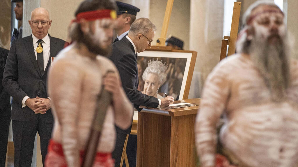 Australia's Prime Minister Anthony Albanese (C) writes in a book as Australia's Governor-General David Hurley (L) looks on during the national service for Britain's Queen Elizabeth II/AFP