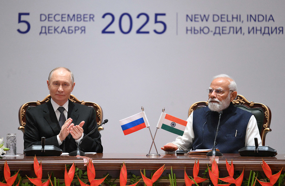 Russia's President Vladimir Putin and India's Prime Minister Narendra Modi are seen after their talks at the Hyderabad House in New Delhi on December 5, 2025. (Photo by Alexander KAZAKOV / POOL / AFP)