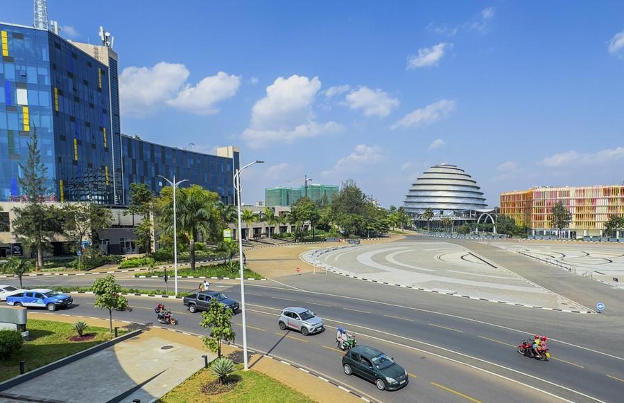 This photo, taken on June 25, 2025, shows the Kigali convention center (center), the Radisson Blu Hotel (right), and the Kigali Heights Mall (left) in Kigali, Rwanda. (Photo by Xinhua)