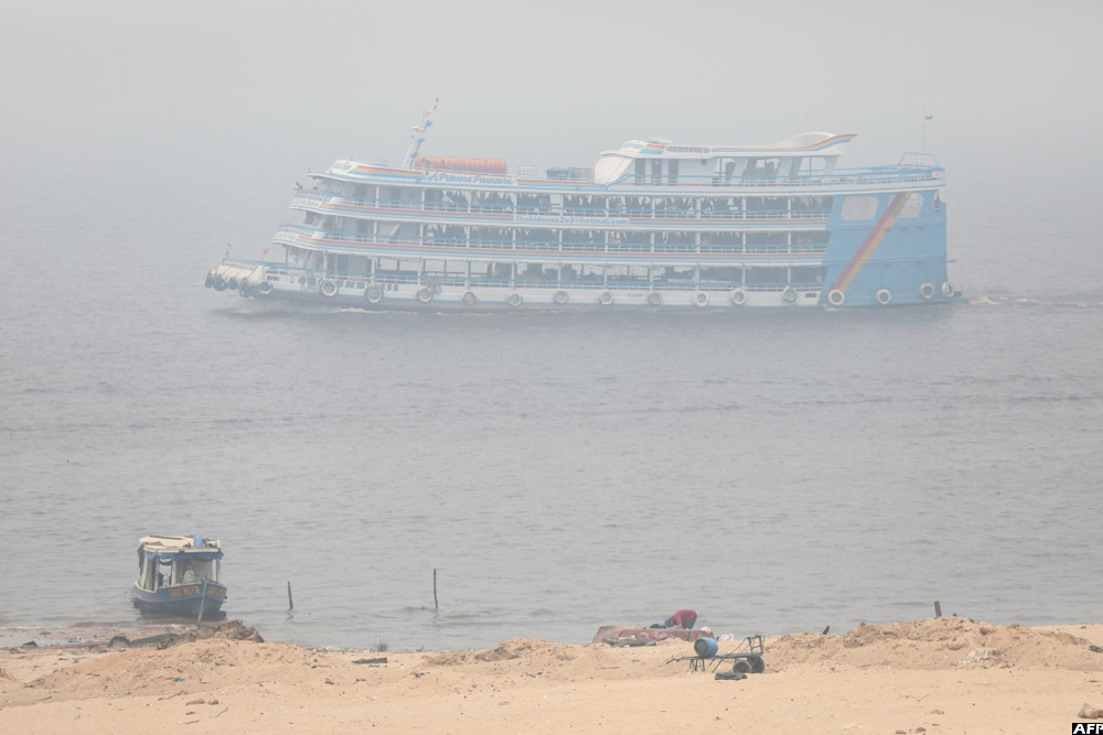 A boat sails on the Negro River as smoke haze from fires in the Amazon rainforest blankets the area in Manaus, Amazonas State, northern Brazil, on Oct. 13, 2023. (AFP)