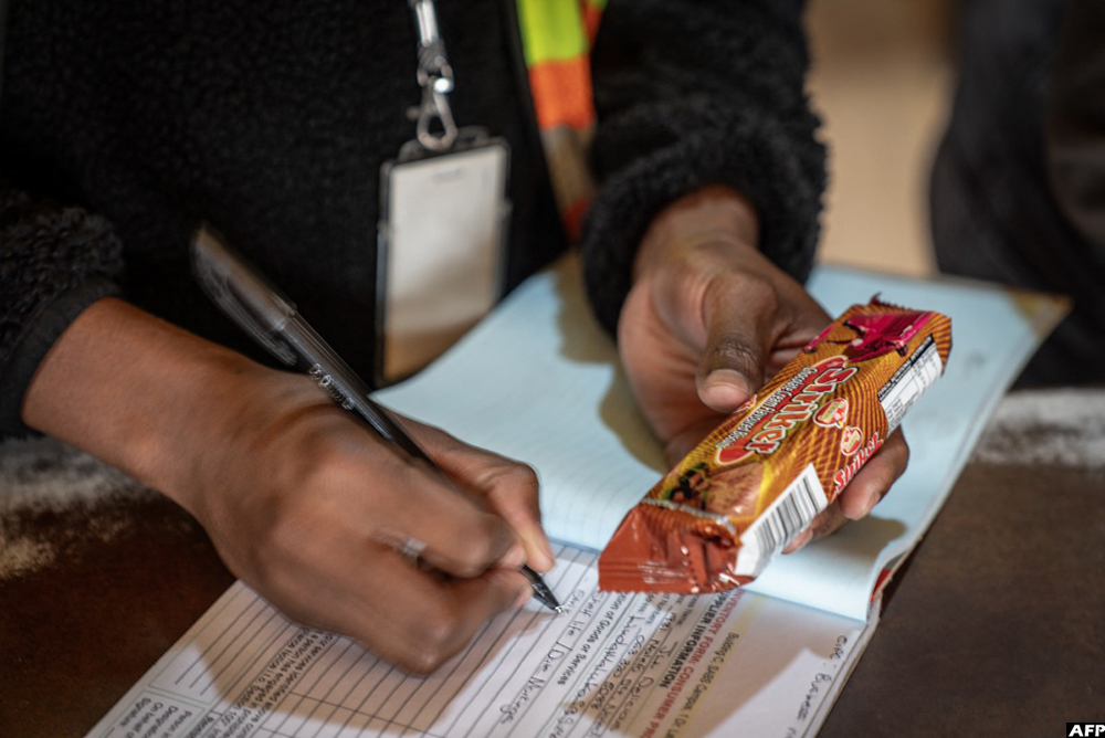A member of the National Consumer Commission records expired biscuits into an inventory book during an inspection on spaza shops in Naledi, Soweto, on October 16, 2024. (AFP)