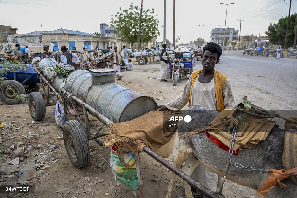 (FILES) People queue to refill donkey-drawn water tanks during a water crisis in Port Sudan in the Red Sea State of war-torn Sudan on April 9, 2024. (AFP)