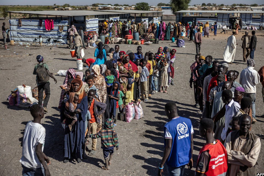 Sudanese refugees and ethnic South Sudanese families who have fled from the war in Sudan line up while waiting to board a truck to go to a Transit Centre for refugees after crossing the border at the Joda Border Crossing Point, near Renk, on February 14, 2024. (AFP)