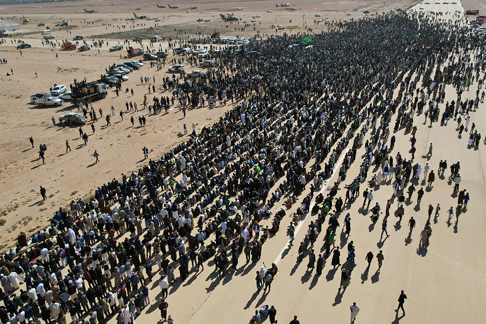This aerial picture shows Libyans gathered for the funeral of Seif al-Islam Gaddafi, the son of Libya's late longtime ruler, in Bani Walid, in the Tripoli region, western Libya on February 6, 2026. (AFP)