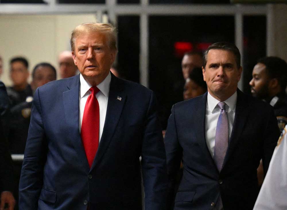 Former US President Donald Trump, with his lawyer Todd Blanche (R), arrives at Manhattan Criminal Court for a hearing in his case of paying hush money to cover up extramarital affairs in New York City on February 15, 2024. (Credit: AFP)