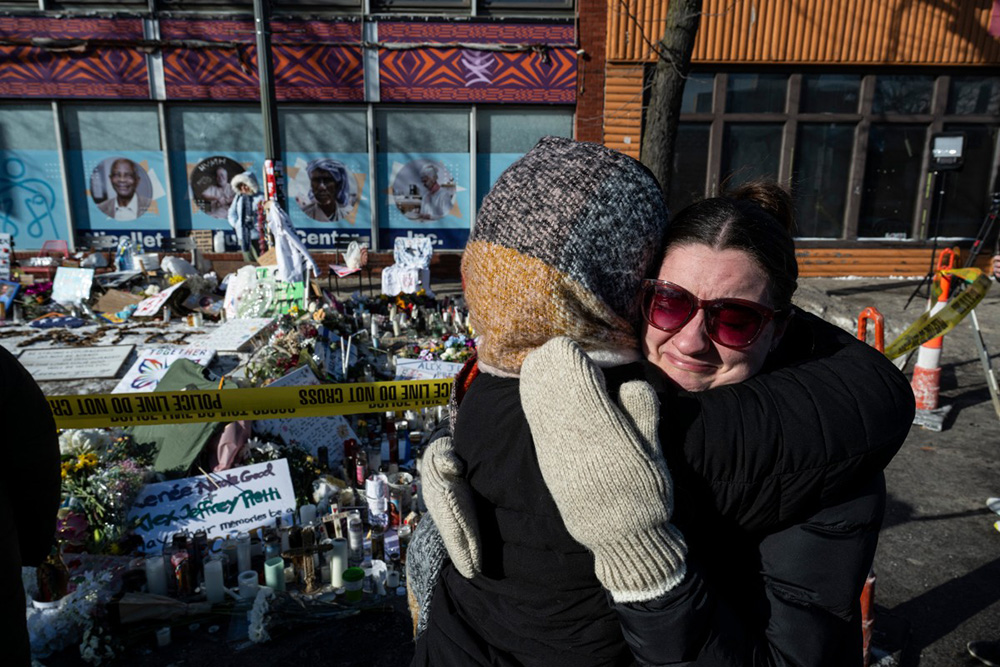 Two women hug at a makeshift memorial in the area where Alex Pretti was shot dead by federal immigration agents in Minneapolis, Minnesota, on January 26, 2026. (Photo by ROBERTO SCHMIDT / AFP)