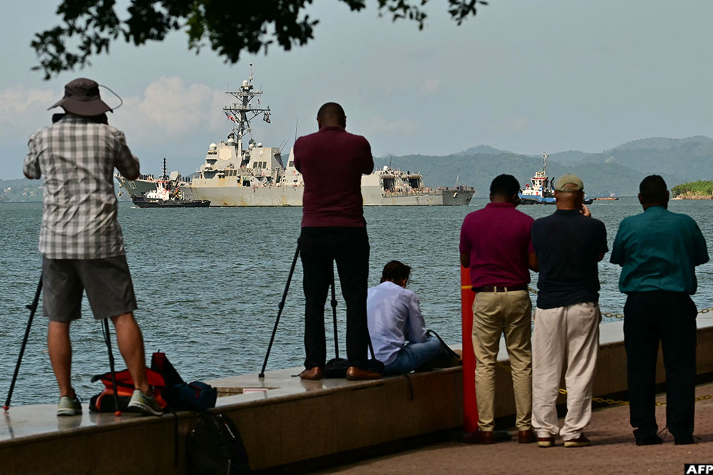 People watch and take pictures of the USS Gravely, a US Navy warship, departing the Port of Spain on October 30, 2025. The US warship arrived in Trinidad and Tobago on October 26, 2025, for joint exercises near the coast of Venezuela, as Washington ratcheted up pressure on drug traffickers and Venezuelan leader Nicolas Maduro. (AFP)