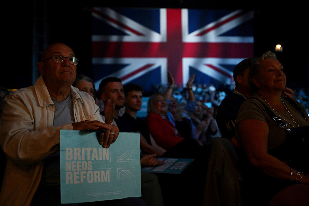 A Reform UK supporter holds a placard during the 'Rally for Reform' at the National Exhibition Centre in Birmingham on June 30, 2024 in the build-up to the July 4 general election. (AFP)