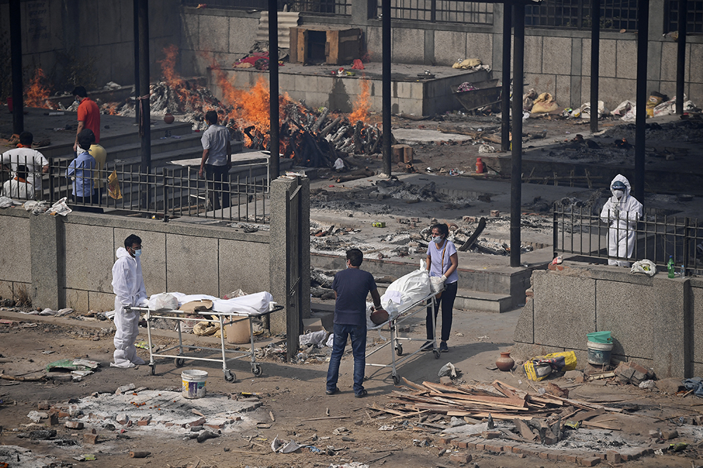 Relatives carry the body of a victim who died due to the Covid-19 coronavirus before cremation at a cremation ground in New Delhi on May 2, 2021. (Photo by TAUSEEF MUSTAFA / AFP)