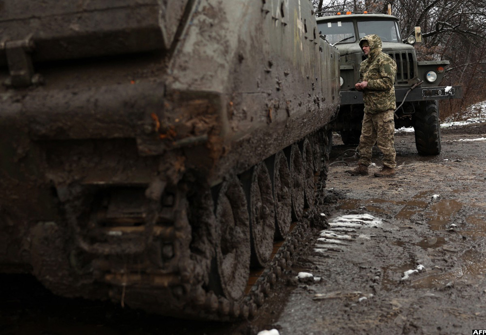 Ukrainian serciceman prepares a broken armoured personnel carrier (APC) in order to evacuate a road in Donetsk region on November 20, 2023. (AFP)