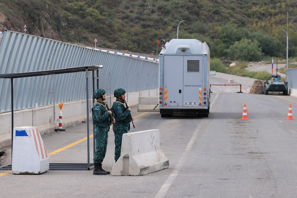 This photograph taken on October 1, 2023 during an Azeri government organized media trip shows Azerbaijani servicemen standing guard at the Lachin checkpoint. (Photo by EMMANUEL DUNAND / AFP)