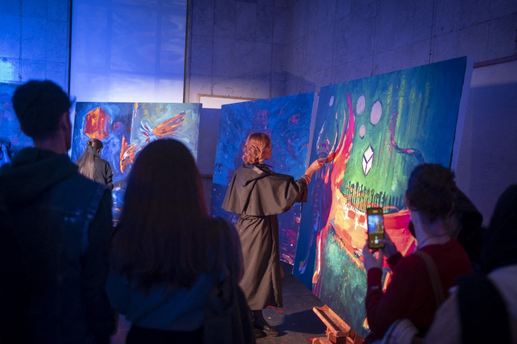 Young Iranian women visit an interactive art show during Tehran Design Week at the University of Tehran in Tehran, Iran, on November 11, 2025.