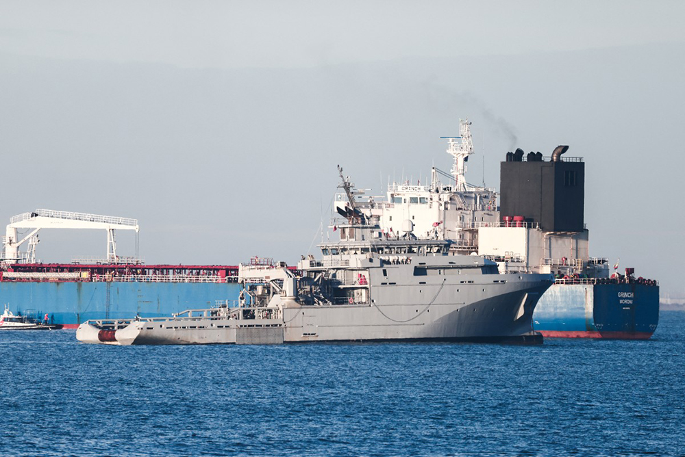 The oil tanker "Grinch", suspected of belonging to the Russian's shadow fleet, is seen outside the coast of Martigues near the port of Marseille-Fos, France, on January 25, 2026, as it's surveilled by the French Navy.