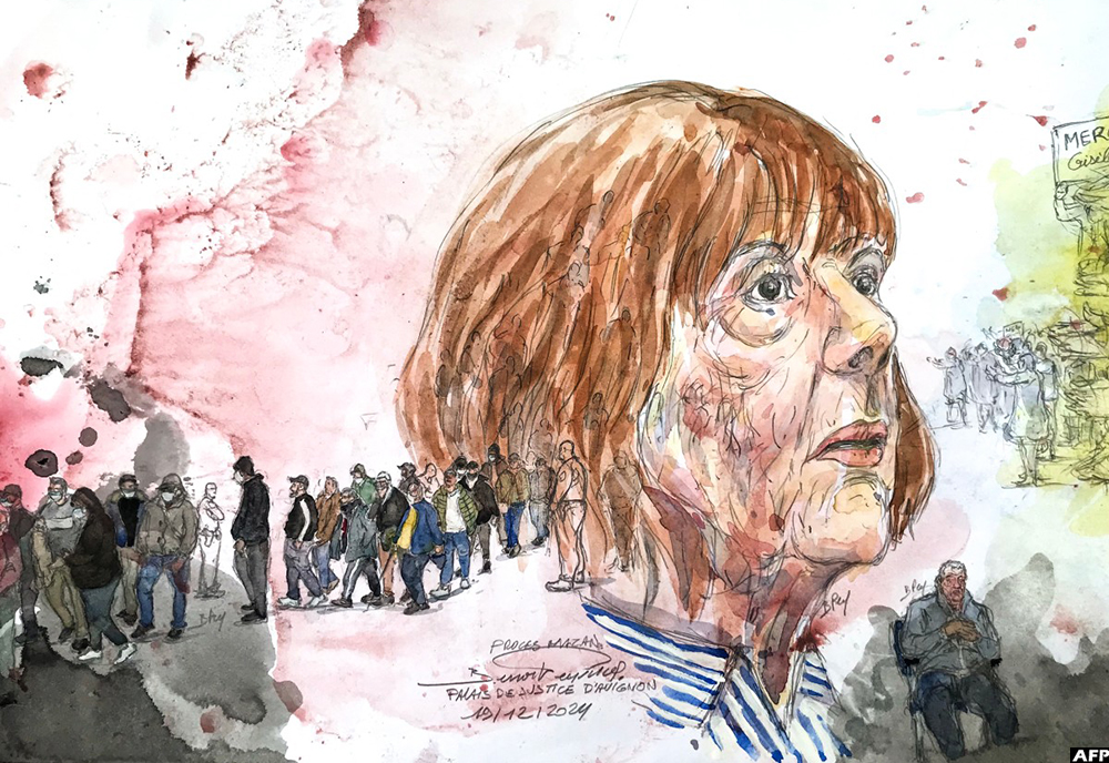 This court-sketch made on December 19, 2024 in Avignon shows Gisele Pelicot during the hearing of the verdict of the court that sentenced her ex-husband to the maximum term of 20 years jail for committing and orchestrating her mass rapes with dozens of strangers he recruited online. (AFP)
