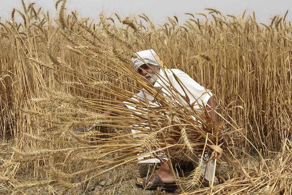 In this file photograph taken on April 12, 2022, an Indian farmer poses as he harvests wheat crop in a field on the outskirts of Amritsar, in the northern Indian state of Punjab. (Photo by NARINDER NA
