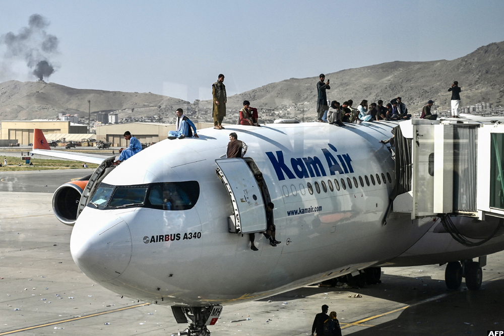 Afghan people climb atop a plane as they wait at the airport in Kabul on August 16, 2021, after a stunningly swift end to Afghanistan's 20-year war. (AFP)