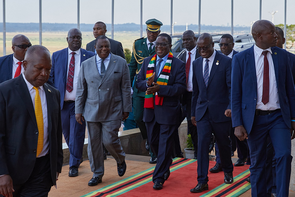 Zimbabwe President and SADC Chairman, Emmerson Mnangagwa (C), arrives for the extraordinary Southern African Development Community (SADC) Summit of Heads of State and Government held in Harare, November 20, 2024, where leaders are set to meet on turmoil in Mozambique and other regional issues (AFP)